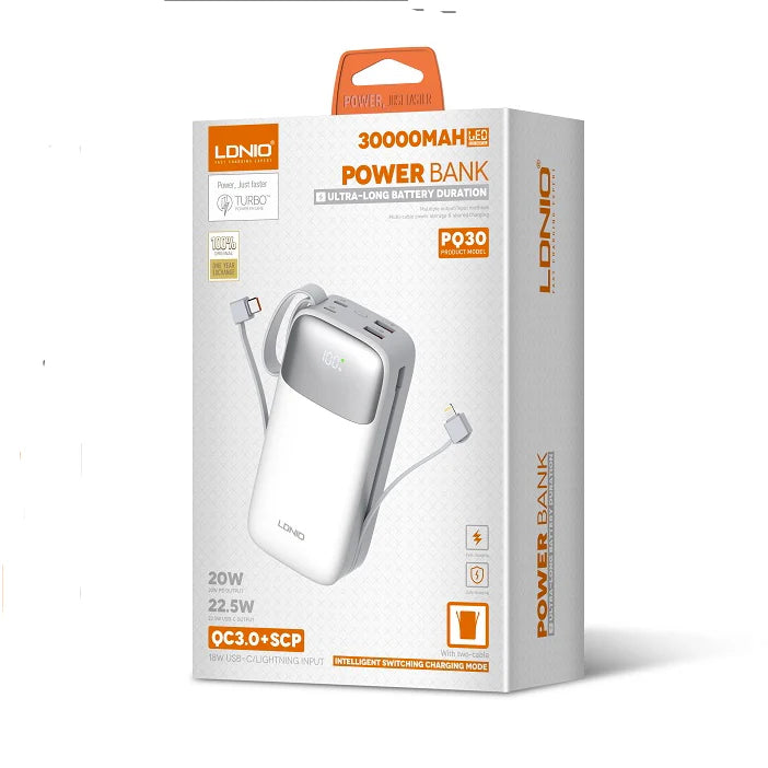 LDNIO PQ30 30000mAh 22.5W USB-C Fast Charging Power Banks smart LED Display Built-in Charging Cable Power Bank